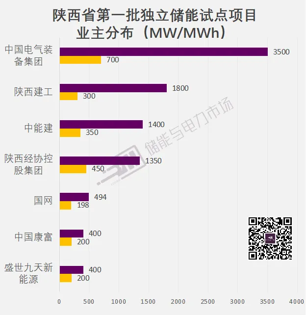 業主分布上看,9個項目共被7個業主分獲,中國電氣裝備規模最大,達到0.7GW/3.5GWh,陜西建工、中能建緊隨其后,獲得儲能項目規模分別為0.3GW/1.8GWh、0.35GW/1.4GWh。