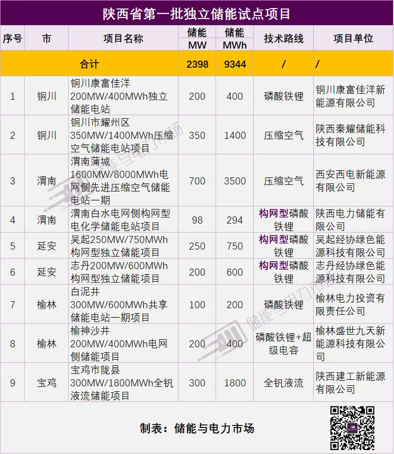 儲能與電力市場獲悉,12月30日,陜西發改委發布關于陜西省第一批獨立儲能試點項目遴選結果的公示,共9個項目,規模合計2.398GW/9.344GWh。技術類型包含磷酸鐵鋰(構網型&跟網型)、壓縮空氣、全釩液流、磷酸鐵鋰+超級電容混合儲能。